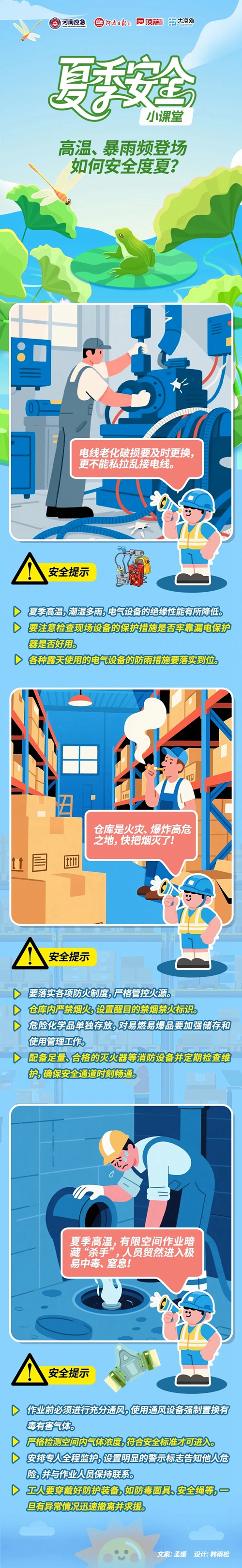 夏季天氣炎熱,同時暴雨、雷電等天氣逐漸增多,生產(chǎn)現(xiàn)場高溫、潮濕,容易導(dǎo)致各類事故發(fā)生。這樣的天氣條件下暗含哪些安全生產(chǎn)隱患?炎炎夏日,生產(chǎn)過程中需要重點防范些什么?一起來學(xué)習——