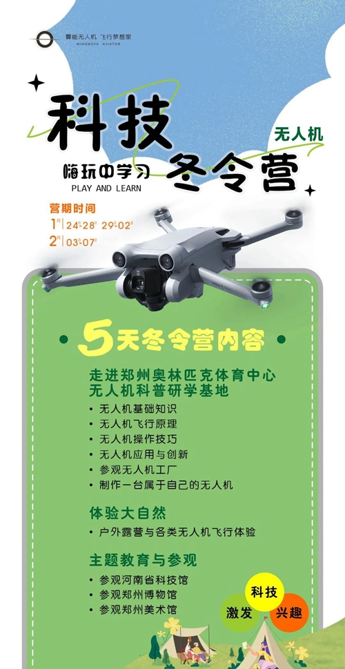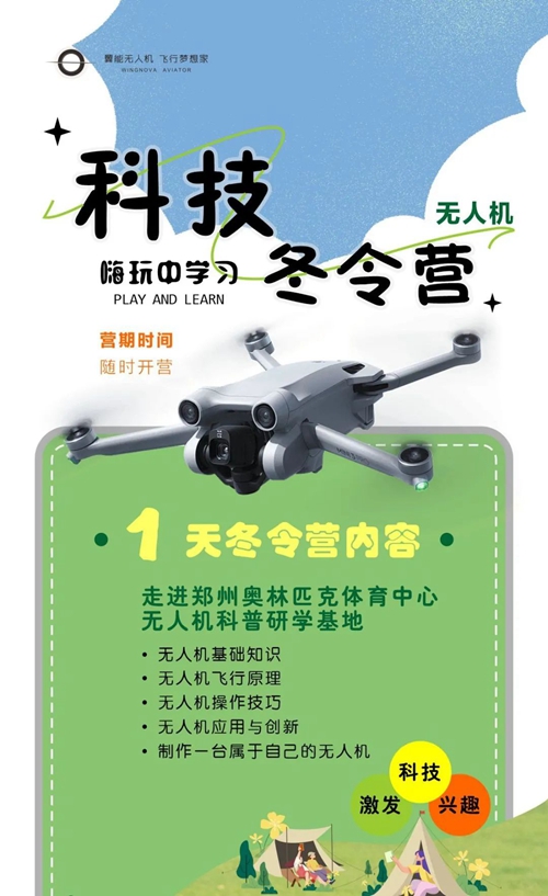 鄭州奧體翼能無(wú)人機(jī)研學(xué)基地是集無(wú)人機(jī)科普、研學(xué)、開(kāi)發(fā)、應(yīng)用、賽事運(yùn)營(yíng)的綜合服務(wù)平臺(tái),不僅擁有1000余平方米的無(wú)人機(jī)科普教育基地,還擁有無(wú)人機(jī)駕駛執(zhí)照的培訓(xùn)資格。寒假期間,依托鄭州奧體中心開(kāi)闊場(chǎng)館,翼能無(wú)人機(jī)將科普知識(shí)與實(shí)操表演完美結(jié)合,分別開(kāi)設(shè)1至5天不等的科技冬令營(yíng),代領(lǐng)孩子們放飛科技?jí)簦卩送嬷袑W(xué)習(xí)。