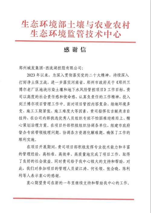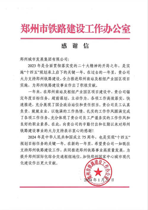 同時(shí),城發(fā)集團(tuán)大力支持鄭州鐵路建設(shè),全力推進(jìn)鄭州南站及樞紐產(chǎn)業(yè)園項(xiàng)目實(shí)施,超前謀劃、主動(dòng)作為,各項(xiàng)工作高效落實(shí)、快速推進(jìn),充分展現(xiàn)了國(guó)企政治站位和責(zé)任擔(dān)當(dāng)。做一件好事,添一份美麗 ,再收到鄭州市鐵路建設(shè)工作辦公室的感謝信!