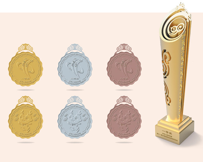 獎(jiǎng)杯《龍鳳書卷》,靈動(dòng)而不失莊重。獎(jiǎng)杯上端外觀基于會(huì)徽核心圖形“龍鳳”,具有較高的辨識(shí)度。龍鳳組成“11”圖案,呈相依相伴騰飛之勢(shì),中間升騰古老的祥云圖案,彰顯中華文明生生不息的活力。獎(jiǎng)杯底座由三級(jí)臺(tái)階組成,寓意“三個(gè)離不開”(漢族離不開各少數(shù)民族,各少數(shù)民族離不開漢族,各少數(shù)民族之間也互相離不開)思想和步步高的美好祝福,激勵(lì)運(yùn)動(dòng)員奮力拼搏。
