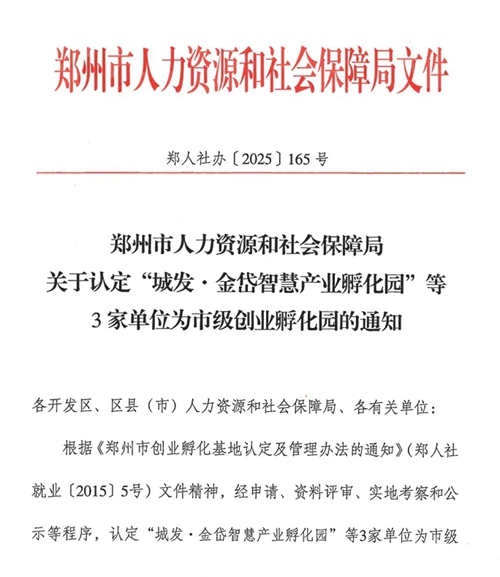 近日,鄭州市人力資源和社會保障局發(fā)布關于認定“城發(fā)·金岱智慧產(chǎn)業(yè)孵化園”等3家單位為市級創(chuàng)業(yè)孵化園的通知。根據(jù)《鄭州市創(chuàng)業(yè)孵化基地及管理辦法的通知》(鄭人社就業(yè)〔2015〕5號)文件精神,經(jīng)申請、資料評審、實地考察和公示等程序,認定“城發(fā)·金岱智慧產(chǎn)業(yè)孵化園”等3家單位為市級創(chuàng)業(yè)孵化園,并頒發(fā)鄭州市創(chuàng)業(yè)孵化園榮譽牌匾。