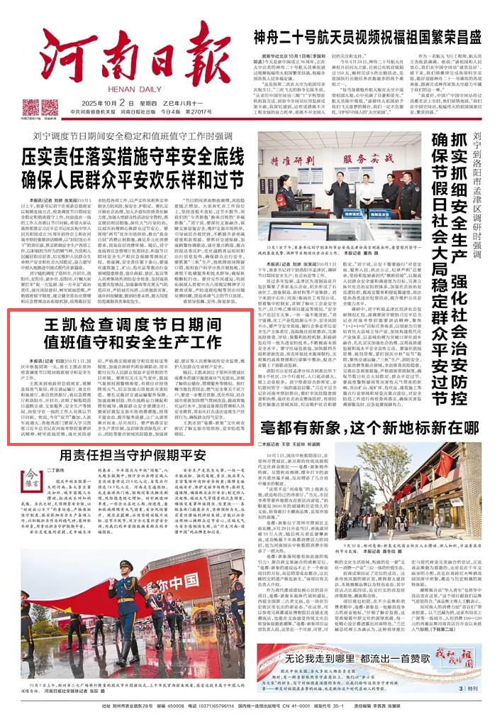 王凱來到省政府總值班室,視頻連線省氣象局、省交通運(yùn)輸廳、省文化和旅游廳、省自然資源廳、省應(yīng)急管理廳和洛陽(yáng)市、開封市,詳細(xì)了解假期首日道路交通、文旅服務(wù)、安全生產(chǎn)等情況,向堅(jiān)守在一線的工作人員致以節(jié)日問候。他說,今年“雙節(jié)”疊加,人流車流量大,各地各部門要深入學(xué)習(xí)貫徹習(xí)近平總書記在河南考察時(shí)重要講話精神,樹牢底線思維,強(qiáng)化風(fēng)險(xiǎn)意識(shí),嚴(yán)格落實(shí)值班值守和信息報(bào)送等制度,加強(qiáng)會(huì)商研判和協(xié)調(diào)聯(lián)動(dòng),用辛勤付出為人民群眾創(chuàng)造平安祥和的節(jié)日環(huán)境。要密切關(guān)注天氣變化,提高氣象預(yù)報(bào)預(yù)警精準(zhǔn)度,有效應(yīng)對(duì)持續(xù)降雨天氣,切實(shí)加強(qiáng)山洪地質(zhì)災(zāi)害防范。要扎實(shí)做好交通運(yùn)輸服務(wù)保障,加強(qiáng)高峰時(shí)段、熱點(diǎn)線路運(yùn)力調(diào)配和管控疏導(dǎo),確保群眾安全便捷出行。要更好激發(fā)文旅市場(chǎng)消費(fèi)潛能,持續(xù)豐富業(yè)態(tài),提升服務(wù)質(zhì)量,讓廣大游客乘興而來、盡興而歸。要嚴(yán)格落實(shí)安全生產(chǎn)責(zé)任制,及時(shí)排查消除?;?、礦山、消防等重點(diǎn)領(lǐng)域風(fēng)險(xiǎn)隱患,加強(qiáng)商超、景區(qū)等人員密集場(chǎng)所安全監(jiān)管,維護(hù)人民群眾生命財(cái)產(chǎn)安全。