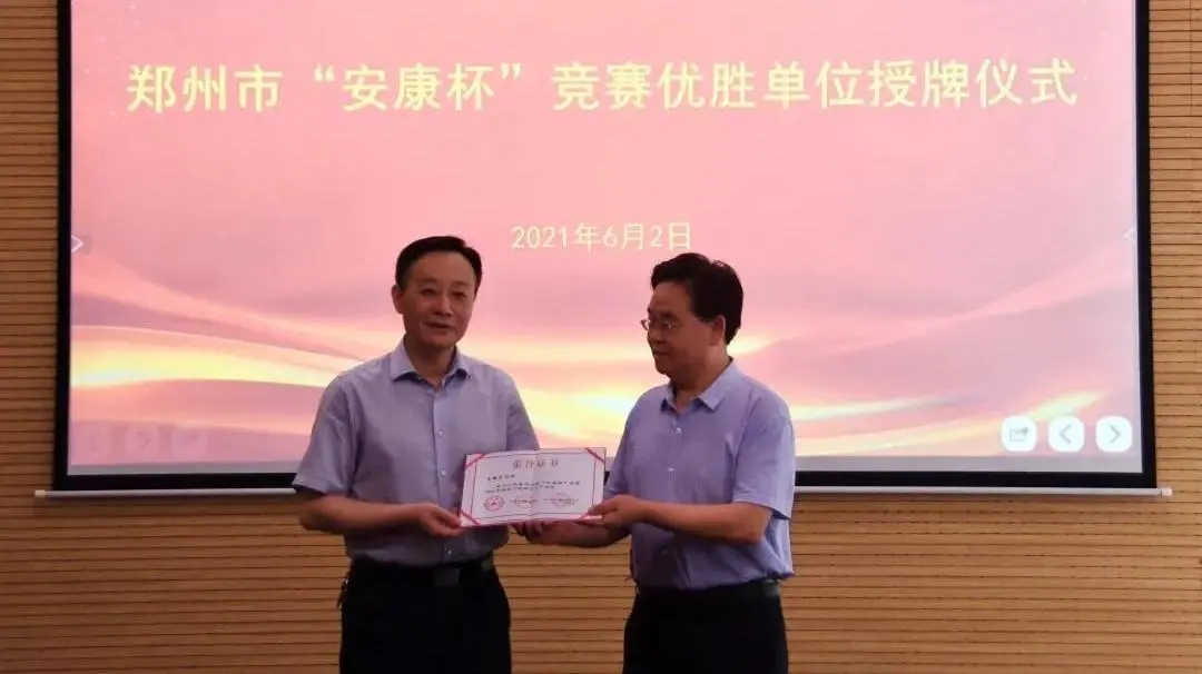 6月2日下午,鄭州市總工會機關(guān)工會主任王銀倉、市總工會勞動和經(jīng)濟部部長宋慧分別向集團兩家獲獎公司頒發(fā)鄭州市“安康杯”競賽優(yōu)勝單位獎牌。